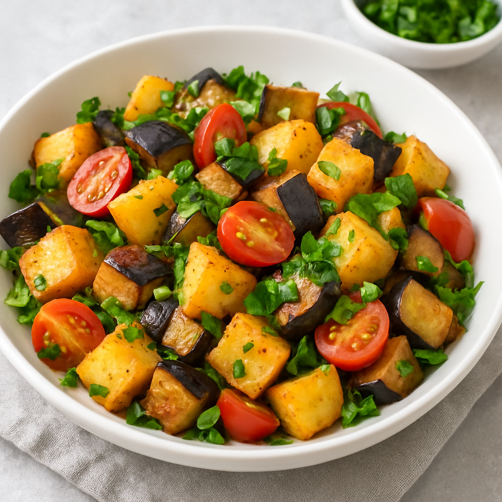 سلطة البطاطس والباذنجان من السلطات الشرقية اللذيذة والمشبعة، تجمع بين حلاوة البطاطس وقوام الباذنجان الطري مع تتبيلة بسيطة تُبرز النكهة. طبق مناسب للتقديم على الغداء أو العشاء، ويمكن تقديمه دافئاً أو بارداً.